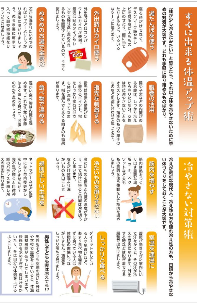 【くらしのヒント】冷え対策で体をポカポカに 2018 1/27 2018.01.27 目次知識 服装に気を付けることは冷え対策の第一歩ですが、さらに実践したい冷え対策があります。自分なりの冷え対策をみつけてみましょう。