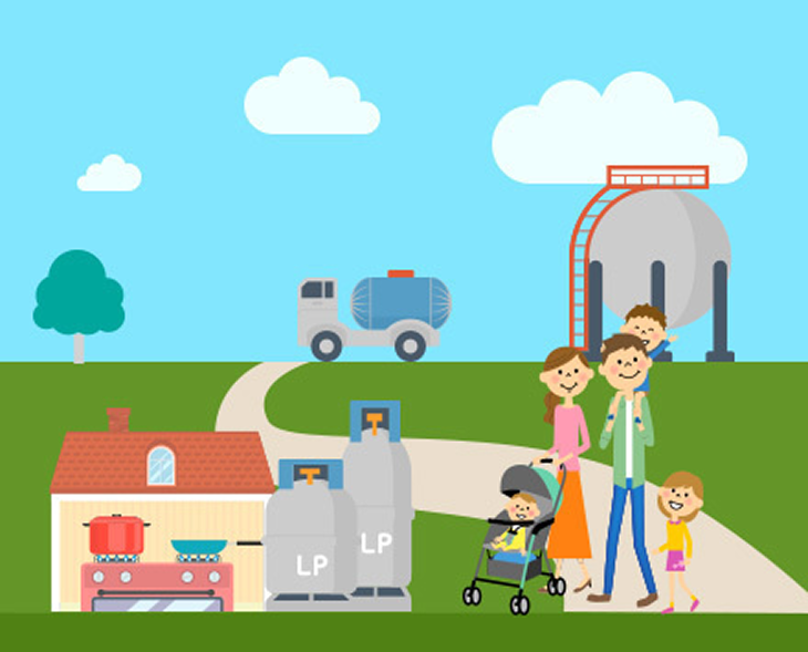 LPガスは常温・常圧では気体ですが、低い圧力をかけることで常温でも容易に液化させることができます。また液体にすると、体積は気体時の1/250となるので、容器に充てんすれば非常に運搬しやすい為、都市部だけでなく都市ガスの配管が届かない場所や、屋台の飲食店などにも運搬し使う事が出来ます。又、タクシーの燃料としても使われています。